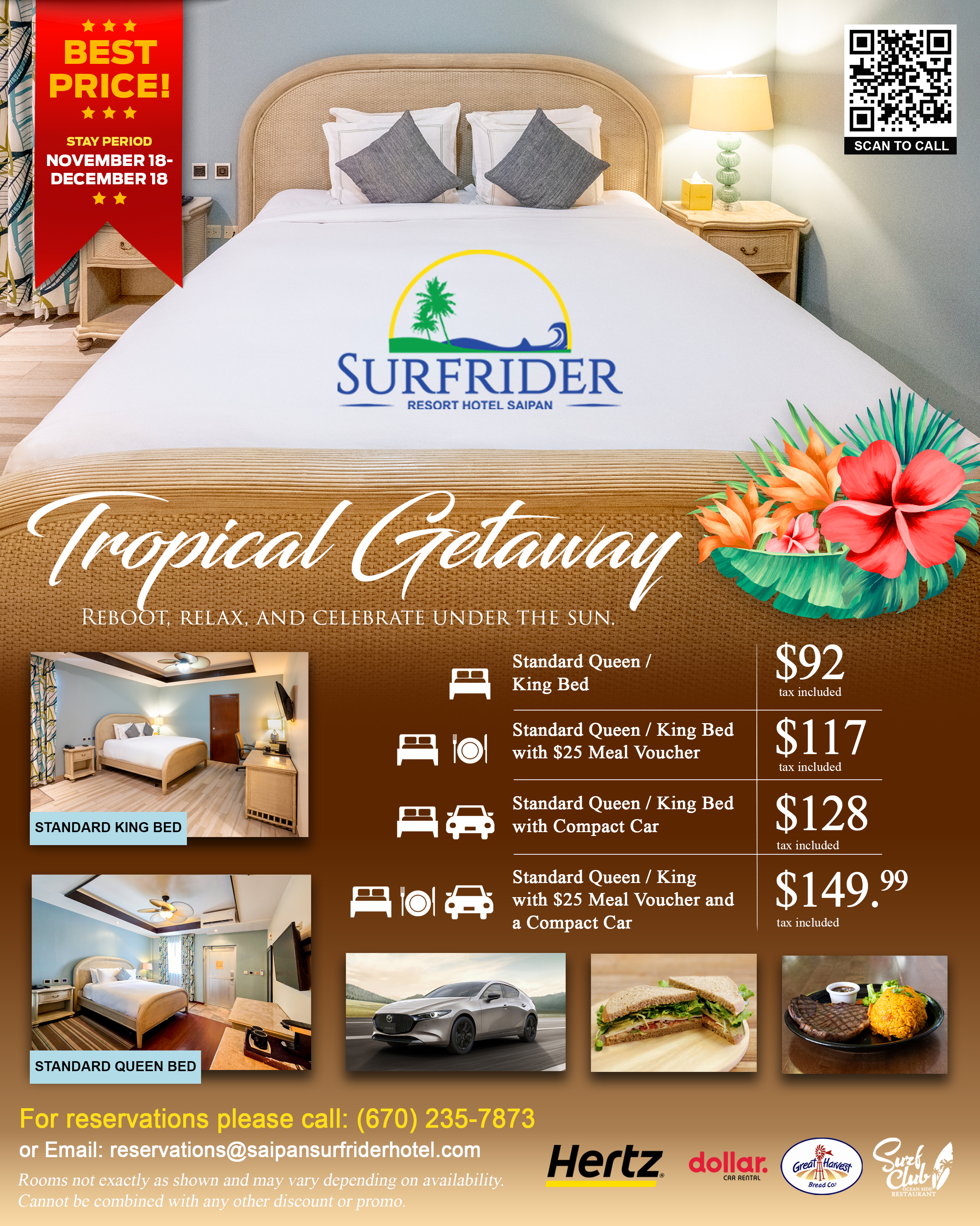 Surfrider Resort Hotel is seconds away from Saipan's most beautiful white beach. We are an affordable option for those seeking relaxation, adventure or need a comfortable place to stay for business.
