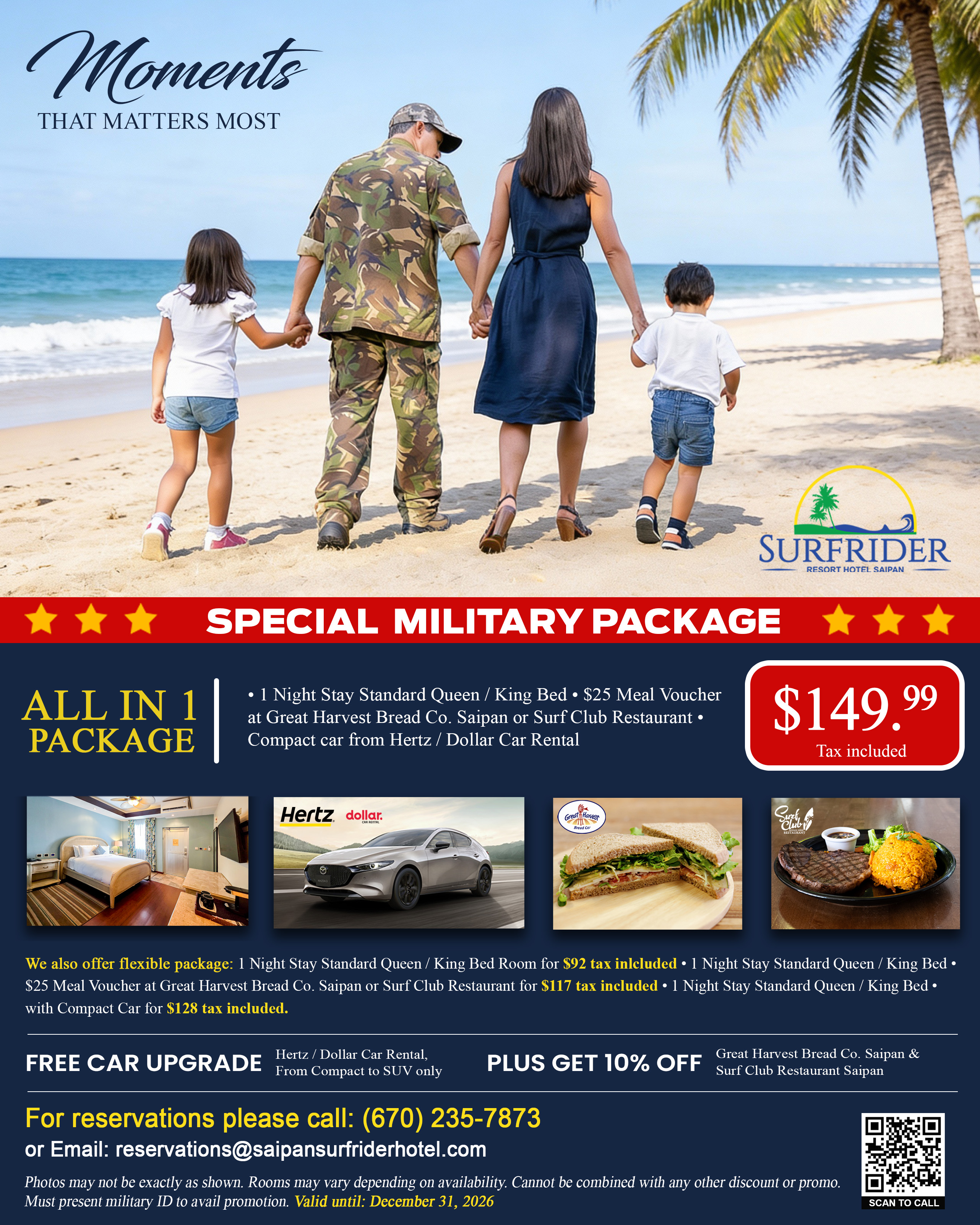 Experience paradise of the Northern Mariana Islands all while you enjoy the amenities and comforts of your hotel room. Wake to the smell of fresh baked goodies from the Great Harvest Bakery and witness breathtaking sunsets beach front of Surf Club Saipan Restaurant, hotel’s dining facility. Surfrider Resort Hotel (SRH) is conveniently located near the Saipan International Airport and a 10-minute drive to Garapan – Saipan’s shopping and entertainment district.